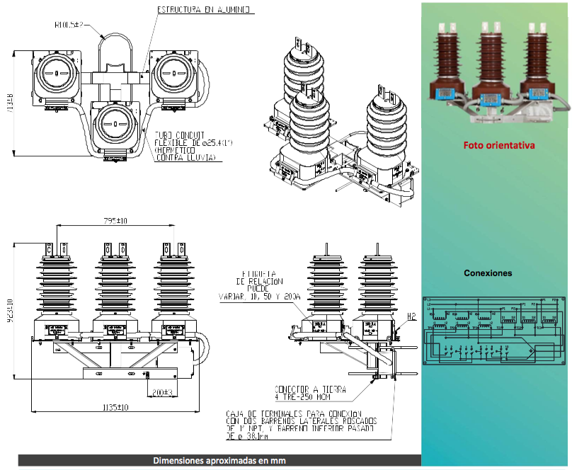 Conjunto formado por transformadores de intensidad y tensión independientes (combinados). Para servicio interior aislamiento seco. Partes activas moldeadas en resina, envolvente exterior metalizado (frente muerto). Cada transformador está unido a la estructura metálica del conjunto que incluye bornes secundarios, con sus conexiones eléctricas correspondientes. Los bornes primarios pueden ser como los representados en la figura o mediante complementos estudiados según sea el caso. Su mantenimiento es prácticamente nulo. Construibles bajo normas UNE, CEI, IEEE. Otras normas o características especiales bajo consulta.